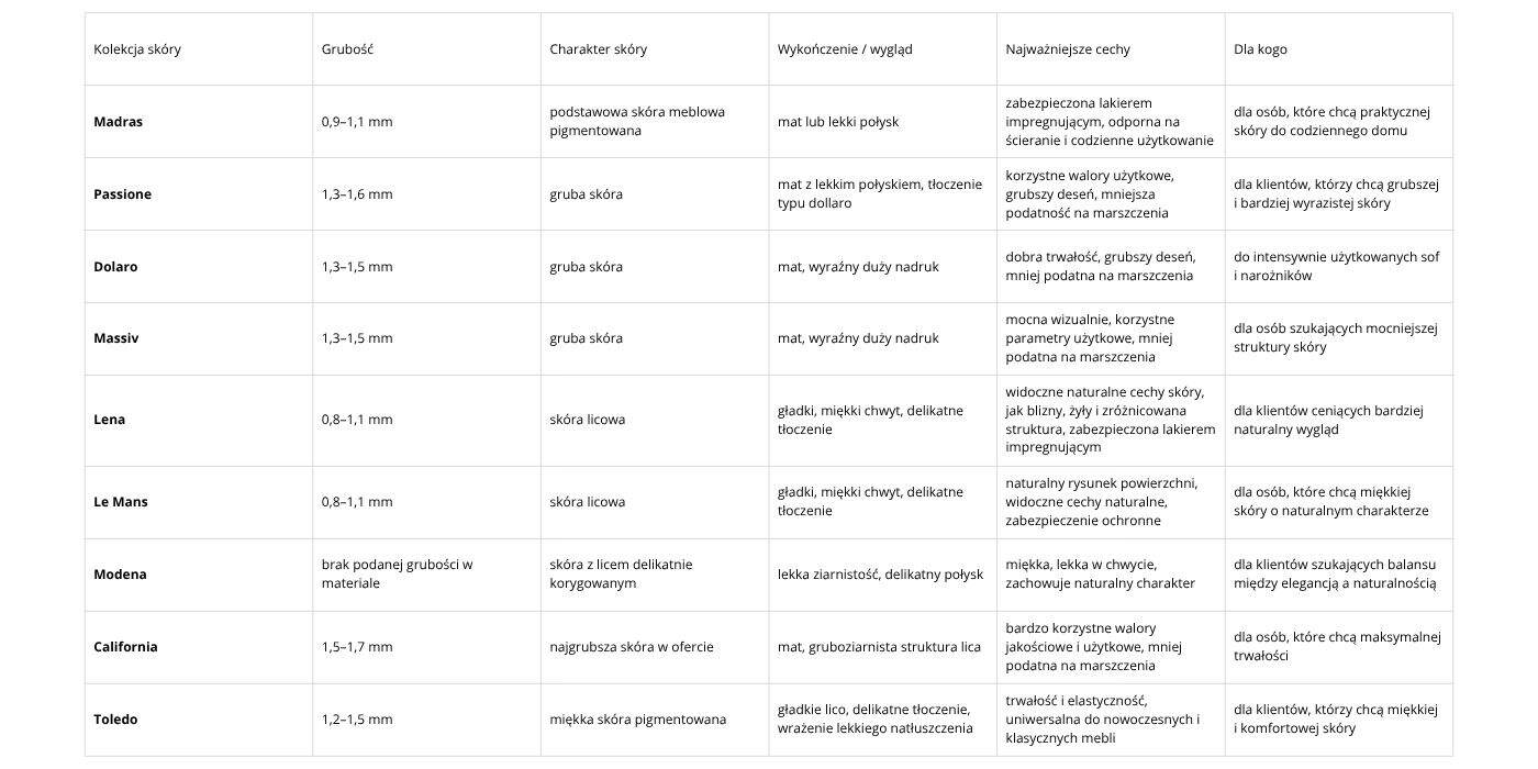 Poznaj dokładnie skóry stosowane w meblach DEKO: Madras, Dolaro, Passione, California i inne. Sprawdź grubości, różnice i wybierz najlepszą skórę do swojego salonu.