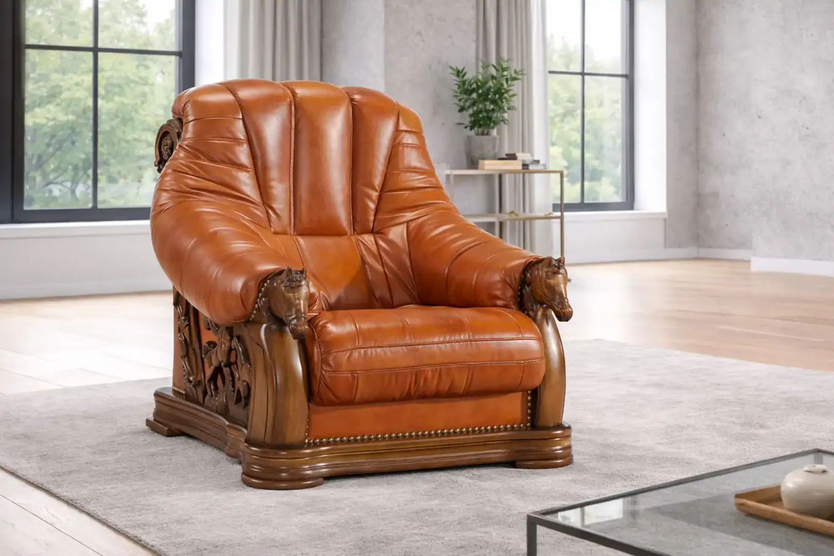 Elegancki model Oskar to połączenie klasycznego wzornictwa z solidnym, ręcznym wykonaniem. Charakterystyczne, staranne przeszycia, wygodne oparcie oraz masywne podłokietniki zapewniają wysoki komfort użytkowania i ponadczasowy wygląd. Całość osadzona jest na efektownym, drewnianym stelażu z dekoracyjnymi detalami, który nadaje meblowi stabilności, trwałości oraz wyjątkowego charakteru.