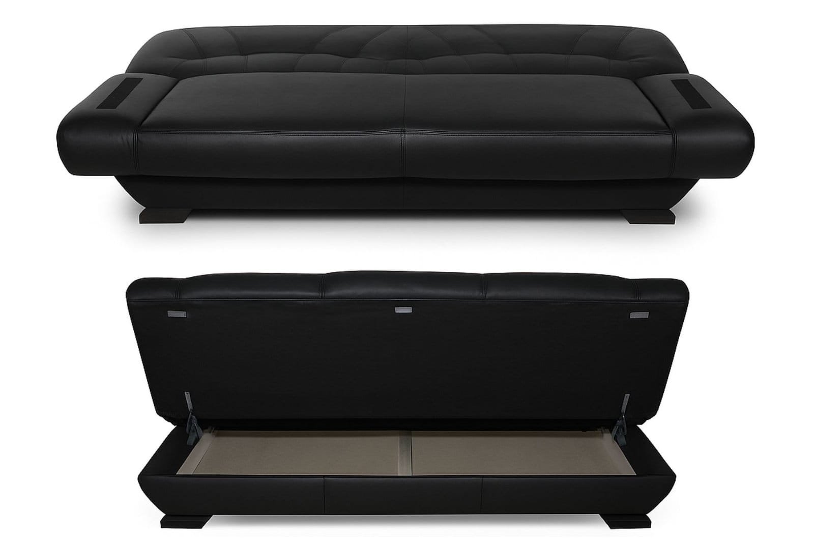 Funkcjonalność to jedna z głównych zalet zestawu. Sofa posiada funkcję spania oraz praktyczny pojemnik na pościel, dzięki czemu komplet sprawdzi się również jako rozwiązanie do codziennego użytkowania. Forma mebla prezentuje się efektownie, zachowując przy tym wygodę i praktyczność.