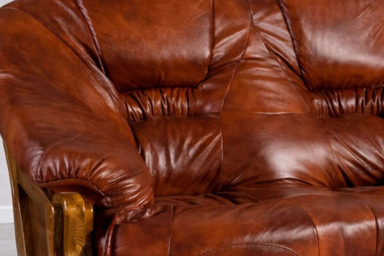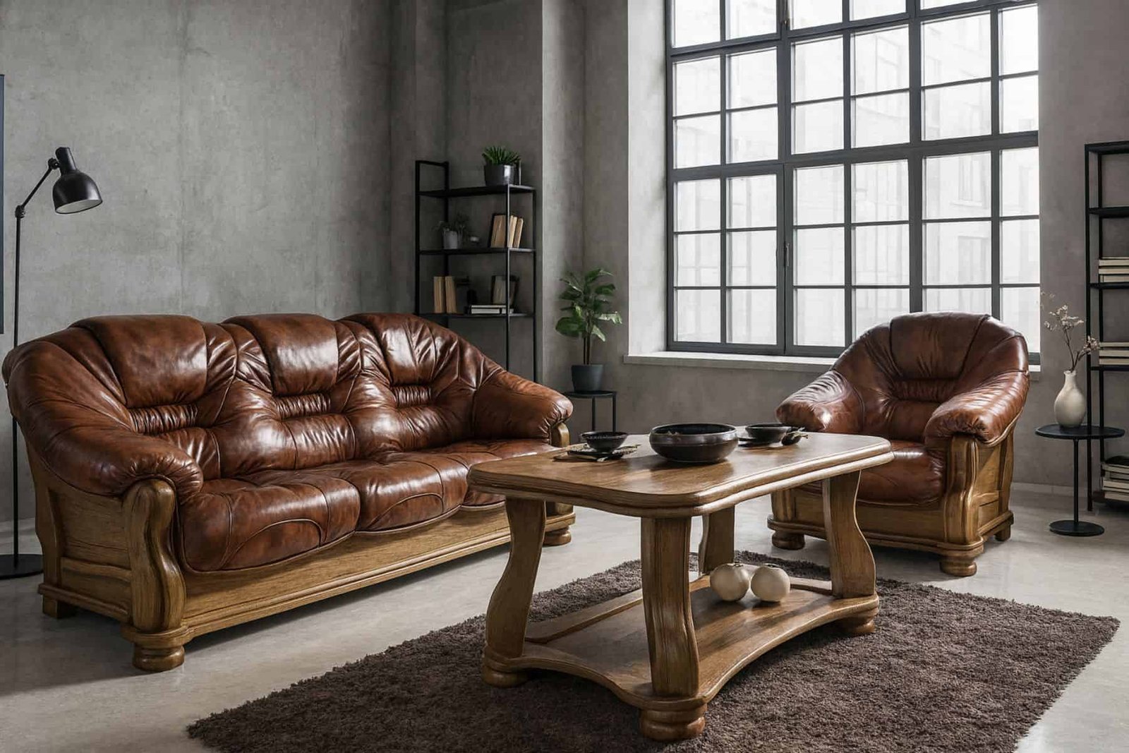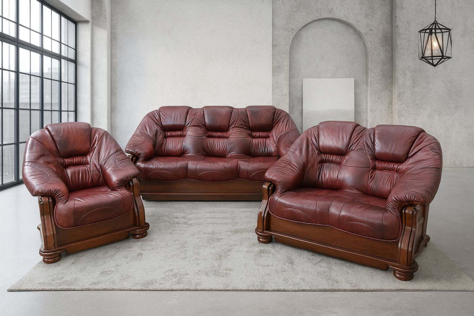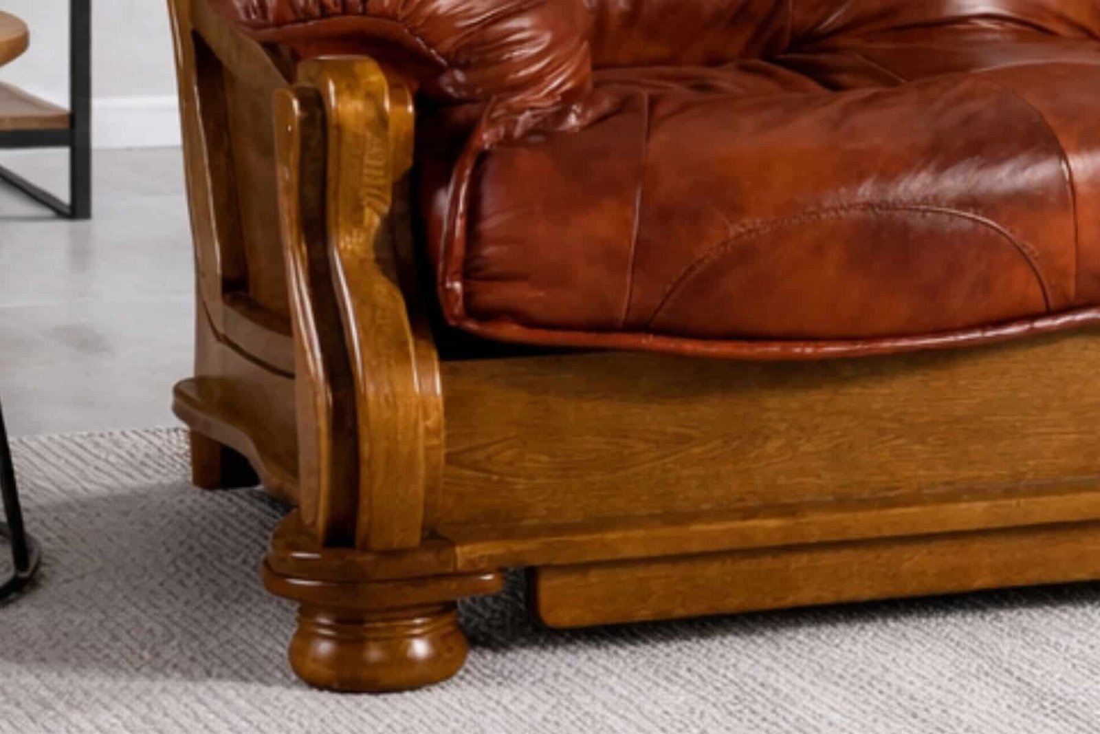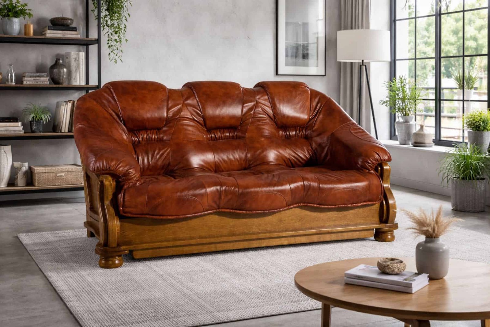 Tapicerka wykonana z wysokogatunkowej skóry naturalnej zachwyca miękkością oraz szlachetną fakturą, a starannie wyprofilowane oparcia i podłokietniki gwarantują wysoki komfort użytkowania. Całość osadzona jest na stelażu z litego drewna, zabudowanym do samej podłogi, co podkreśla stabilność konstrukcji oraz prestiżowy charakter zestawu.