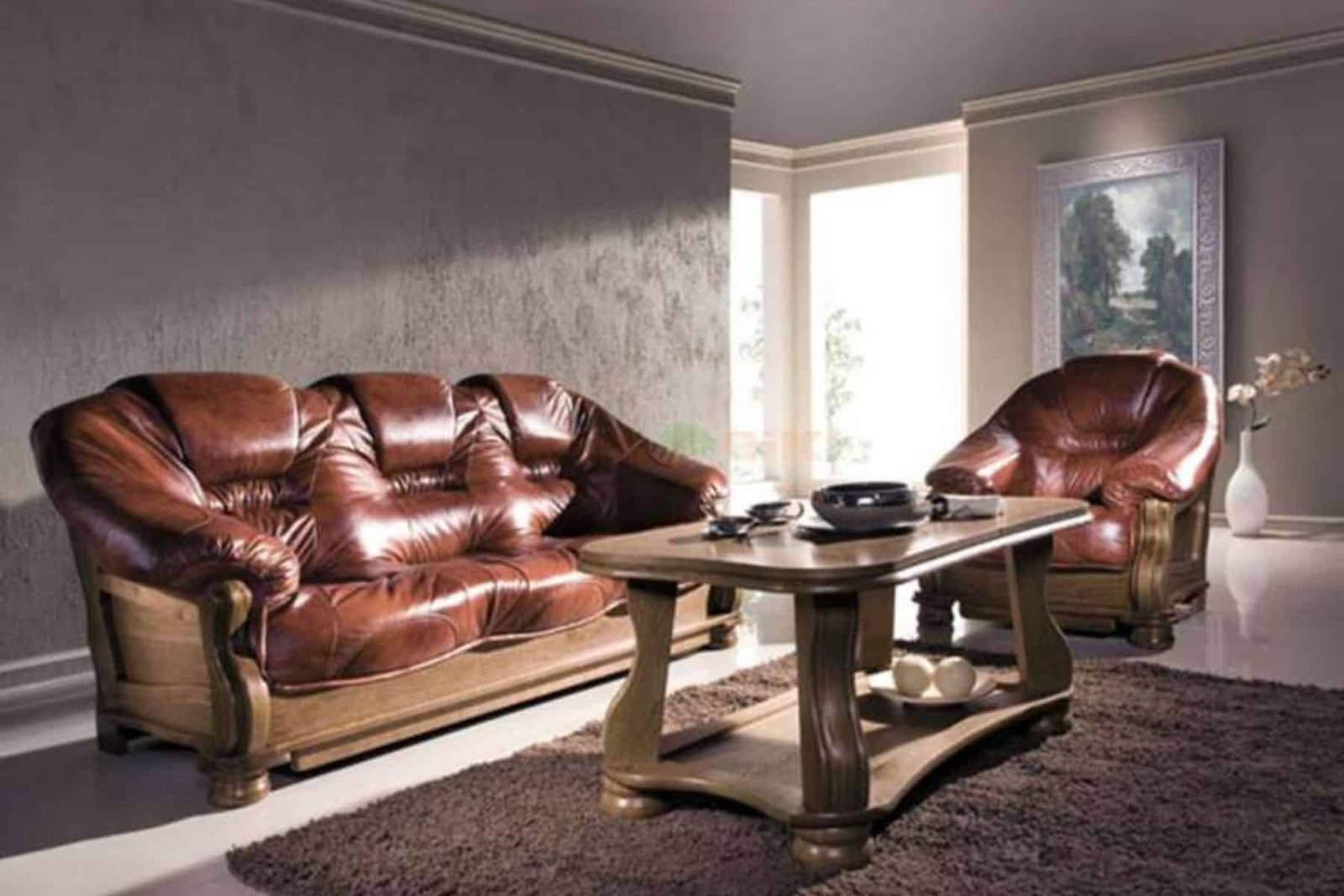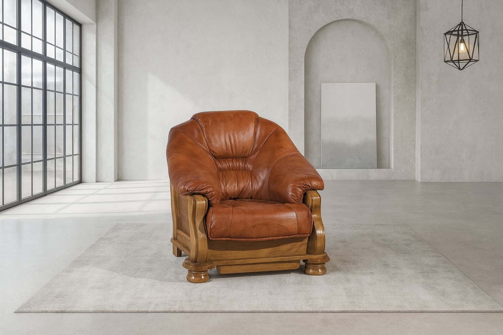 Tapicerka wykonana z wysokogatunkowej skóry naturalnej zachwyca miękkością oraz szlachetną fakturą, a starannie wyprofilowane oparcia i podłokietniki gwarantują wysoki komfort użytkowania. Całość osadzona jest na stelażu z litego drewna, zabudowanym do samej podłogi, co podkreśla stabilność konstrukcji oraz prestiżowy charakter zestawu.