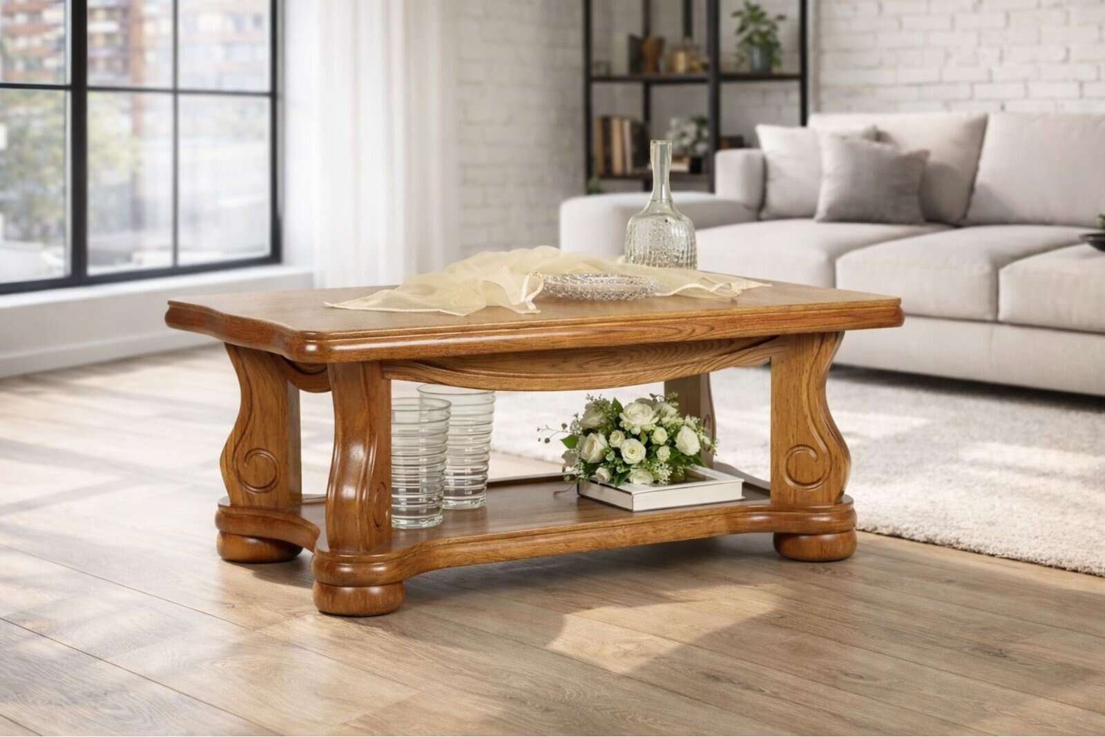 Ława Ciężka to masywny stolik kawowy wykonany z naturalnego drewna, zaprojektowany z myślą o trwałości i klasycznej estetyce. Gruby blat, stabilne nogi oraz charakterystyczne frezowania nadają jej wyrazisty, solidny wygląd. To mebel, który dobrze sprawdza się w centralnej części salonu i bez problemu znosi codzienne użytkowanie.