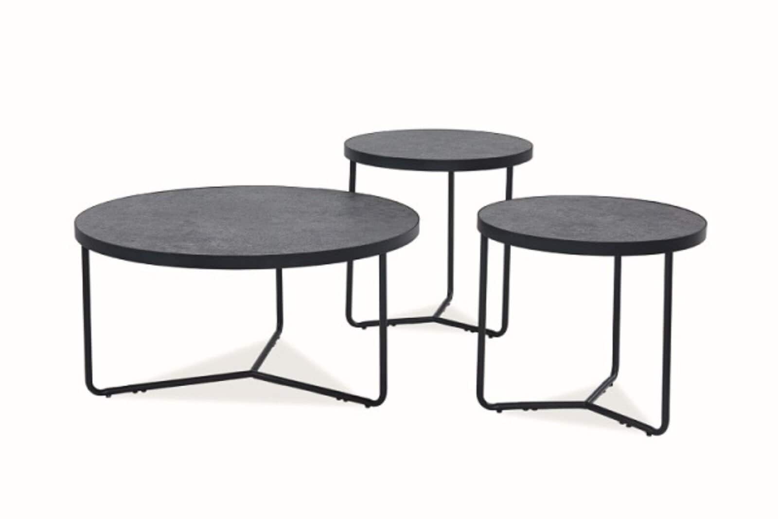 DEMETER to zestaw trzech ław, które dostępne są w odmiennych rozmiarach oraz wielkościach, dzięki czemu można je zaaranżować wspólnie w jednym pomieszczeniu lub stworzyć z nich osobne stylizacje. Prezentowane ławy o okrągłych blatach stworzone są z płyty MDF zestawionej z okleiną i wykończonej w efekcie betonu. Natomiast stelaż, na który składają się trzy nóżki połączone ze sobą w kształtach niestandardowych płoz, wykonano z metalu malowanego na kolor czarny.