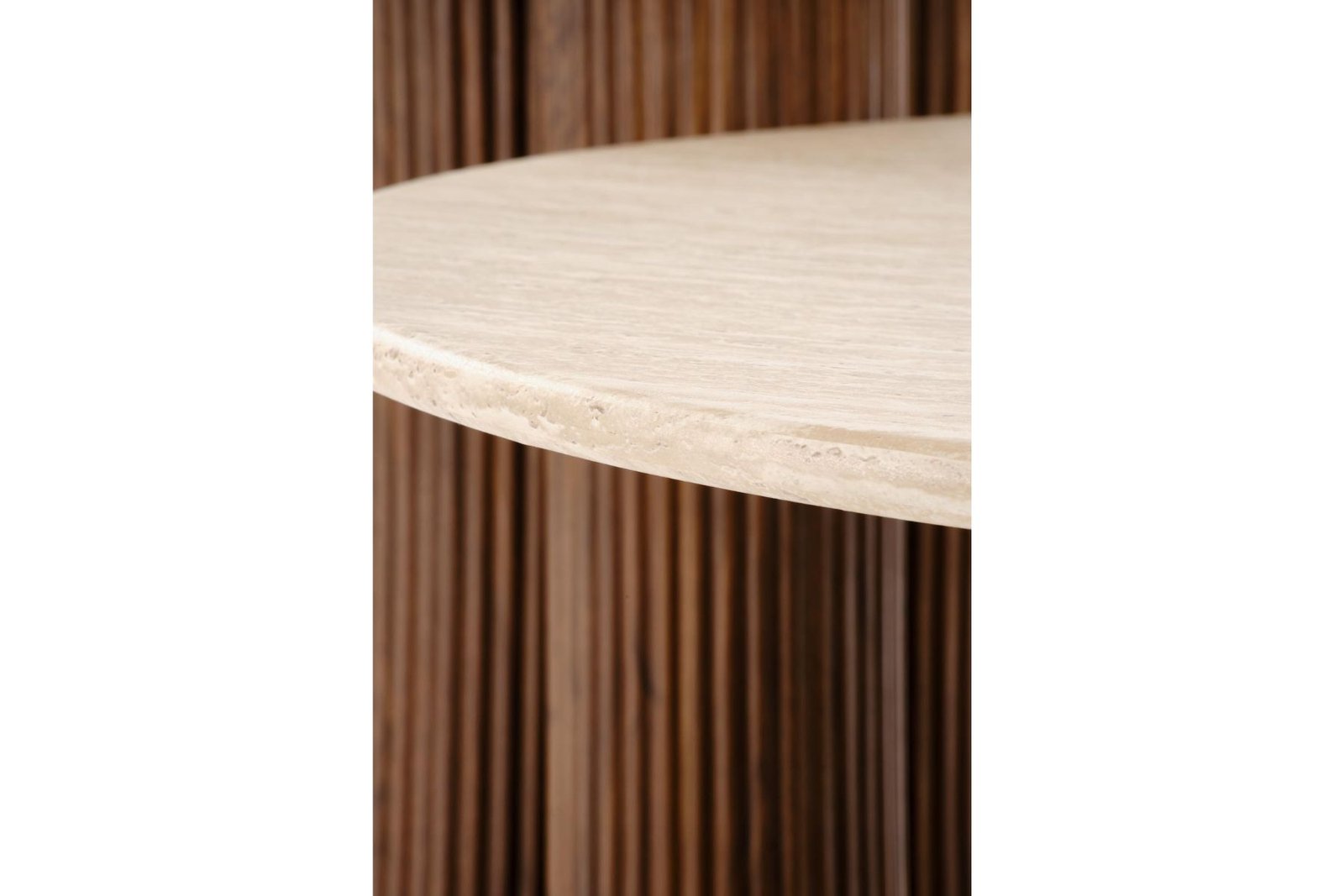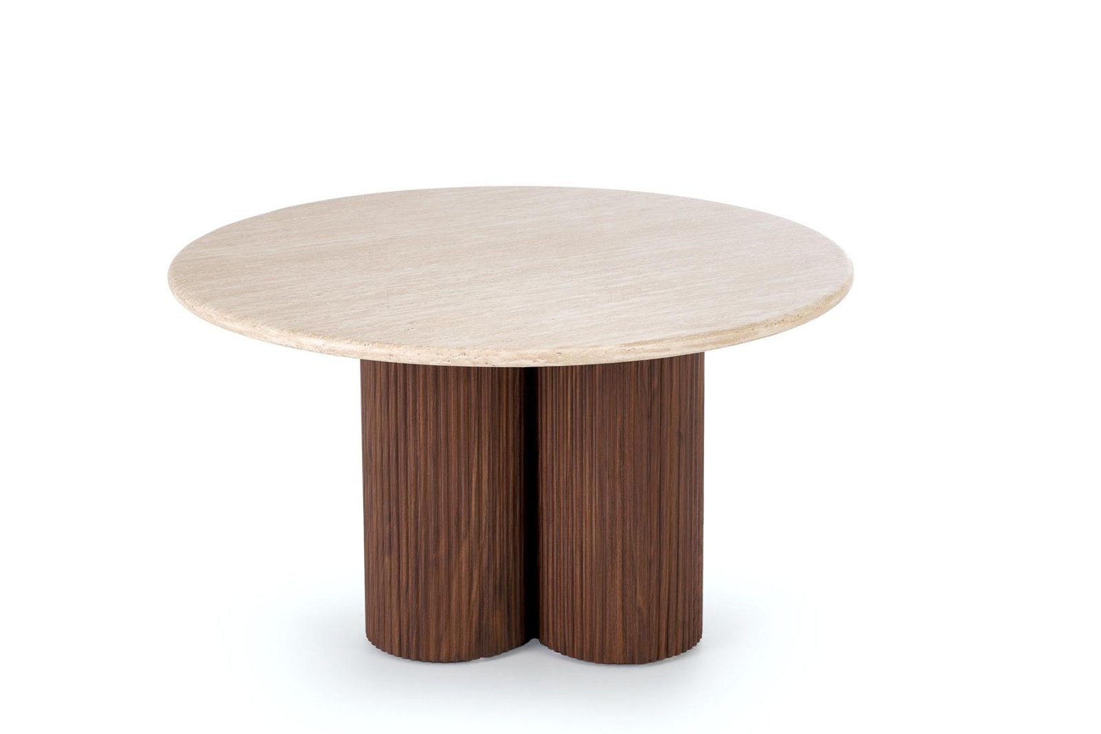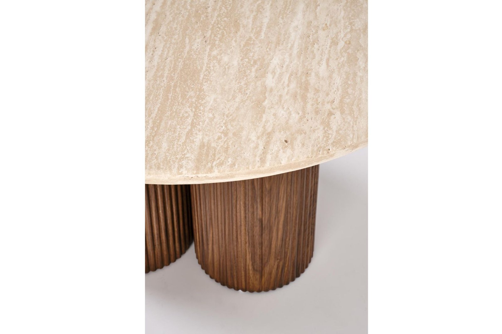 Blat wspiera się na podstawie złożonej z kilku cylindrycznych elementów z pionowym ryflowaniem, widocznej na zdjęciu. Taka konstrukcja zapewnia stabilne podparcie i pełni rolę wyraźnego akcentu wizualnego, dzięki czemu ława może stać się centralnym punktem aranżacji salonu.