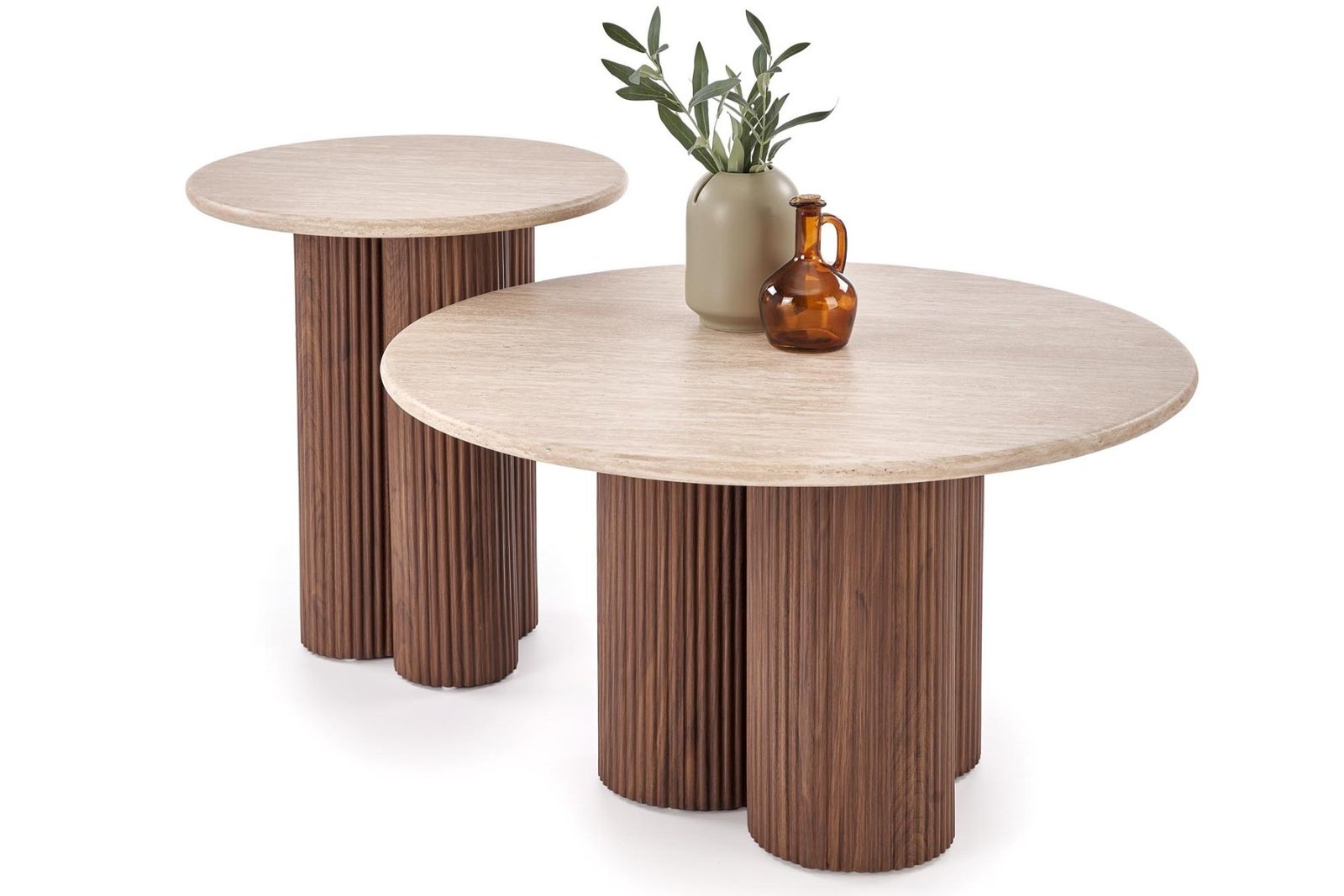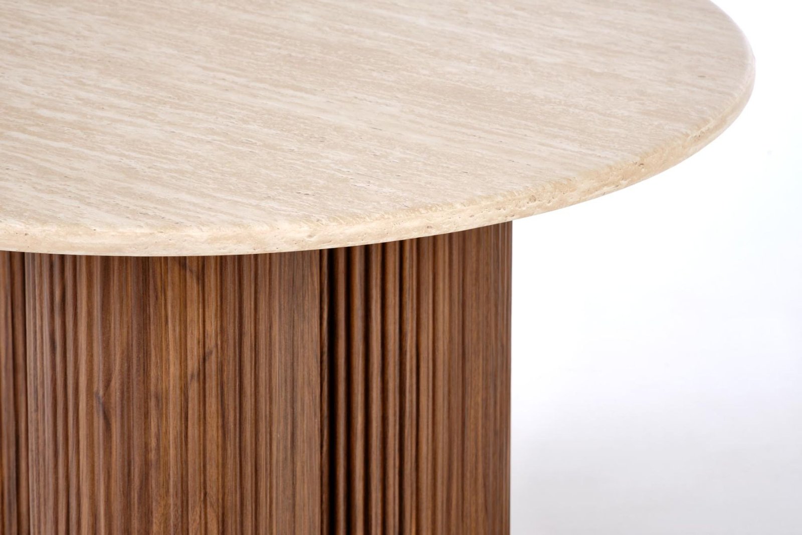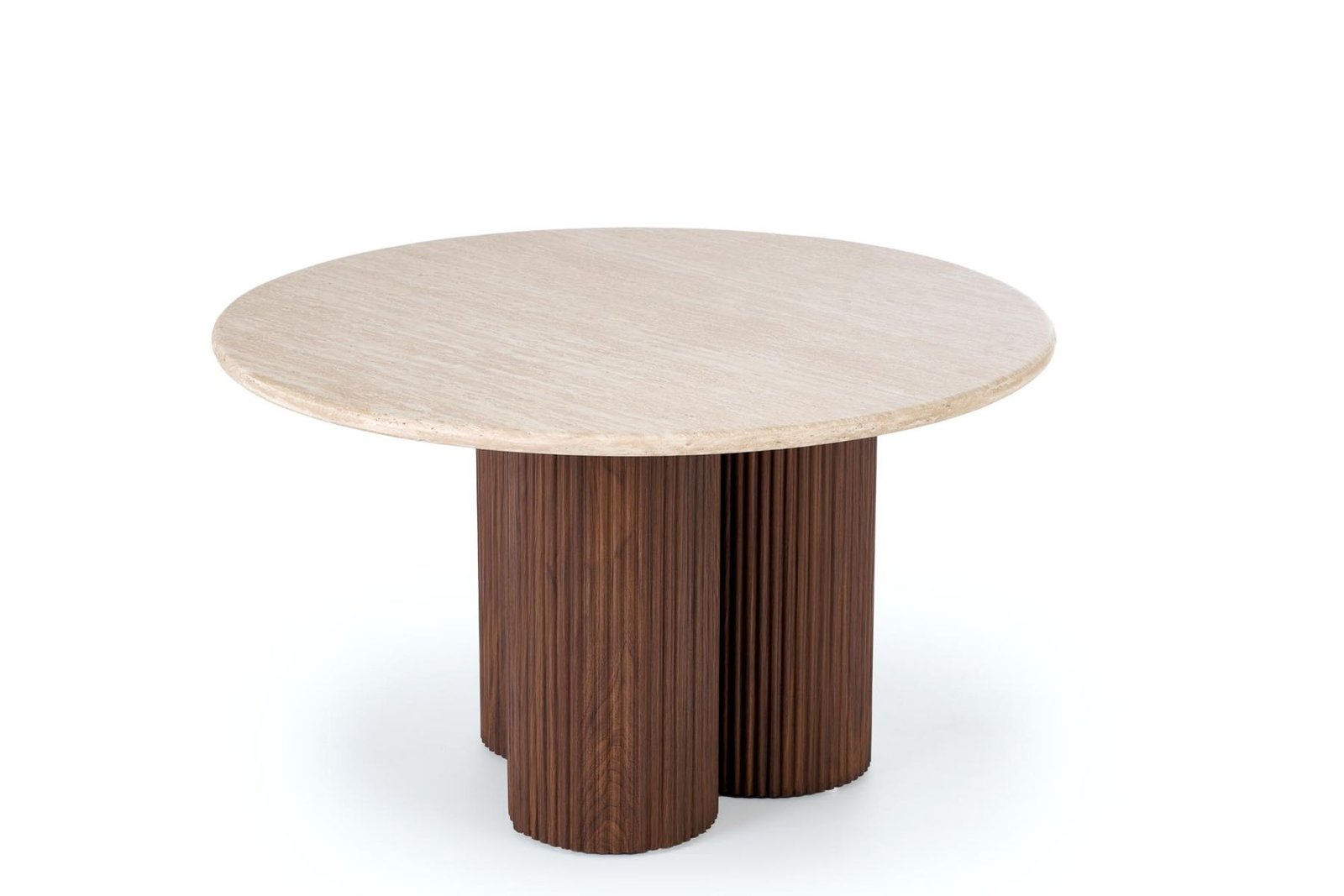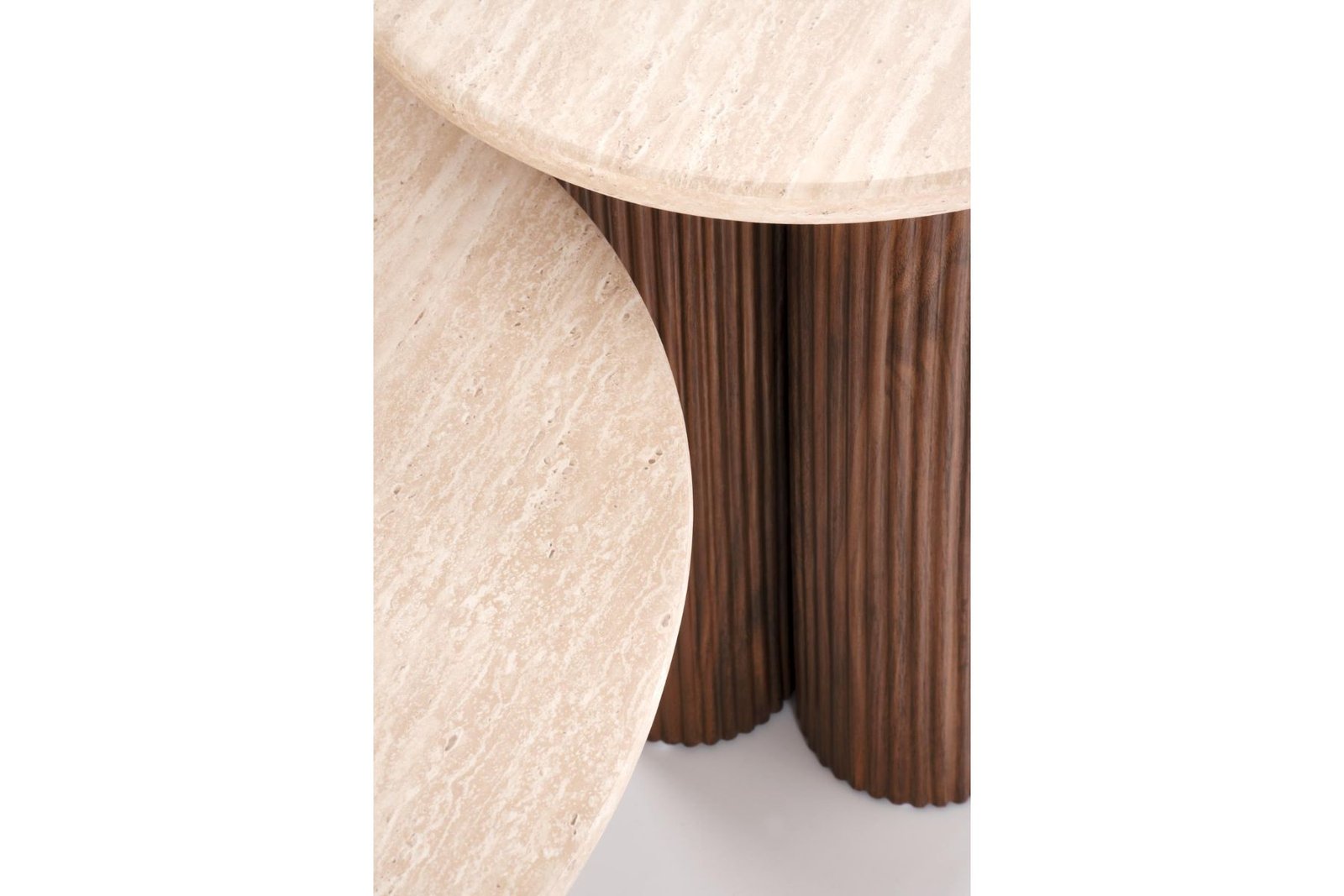 Blat wspiera się na podstawie złożonej z kilku cylindrycznych elementów z pionowym ryflowaniem, widocznej na zdjęciu. Taka konstrukcja zapewnia stabilne podparcie i pełni rolę wyraźnego akcentu wizualnego, dzięki czemu ława może stać się centralnym punktem aranżacji salonu.