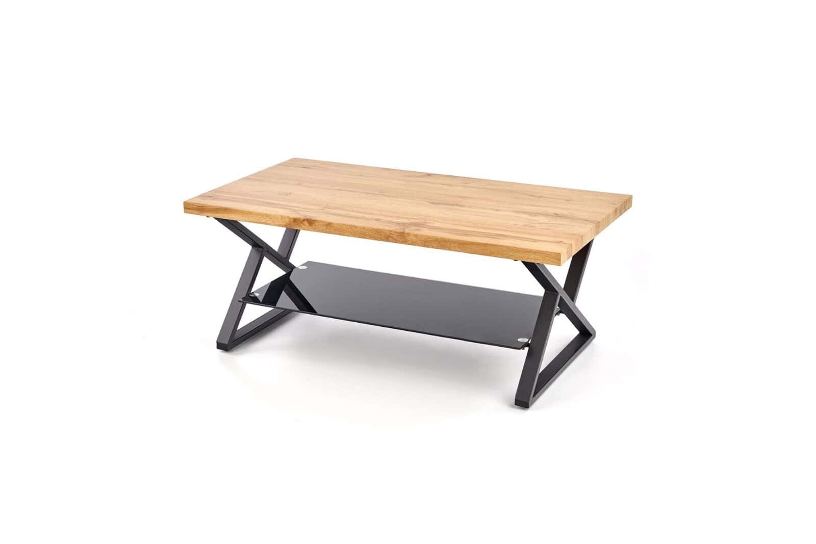 Ława XENA PROSTOKĄT to drewniana ława do salonu w stylu loft. Blat ławy wykonany jest z płyty MDF okleinowanej w kolorze dąb naturalny. Podstawa ławy to stal malowana proszkowo na kolor czarny. Ława wyposażona jest w szklaną półkę, która będzie doskonałym miejscem na odłożenie gazet, pilotów od telewizora czy ulubionej książki, gdy potrzebujemy miejsca na blacie.