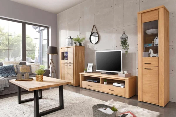 Każdy element kolekcji Natura został zaprojektowany z myślą o funkcjonalności oraz estetyce. Przeszklone witryny idealnie nadają się do ekspozycji ozdób i książek, a praktyczne komody oraz szafki RTV oferują dużo miejsca do przechowywania, zachowując jednocześnie stylowy wygląd. Meble te doskonale sprawdzą się w salonach, nadając im świeżości i harmonii dzięki swojej surowej, a zarazem ciepłej stylistyce.