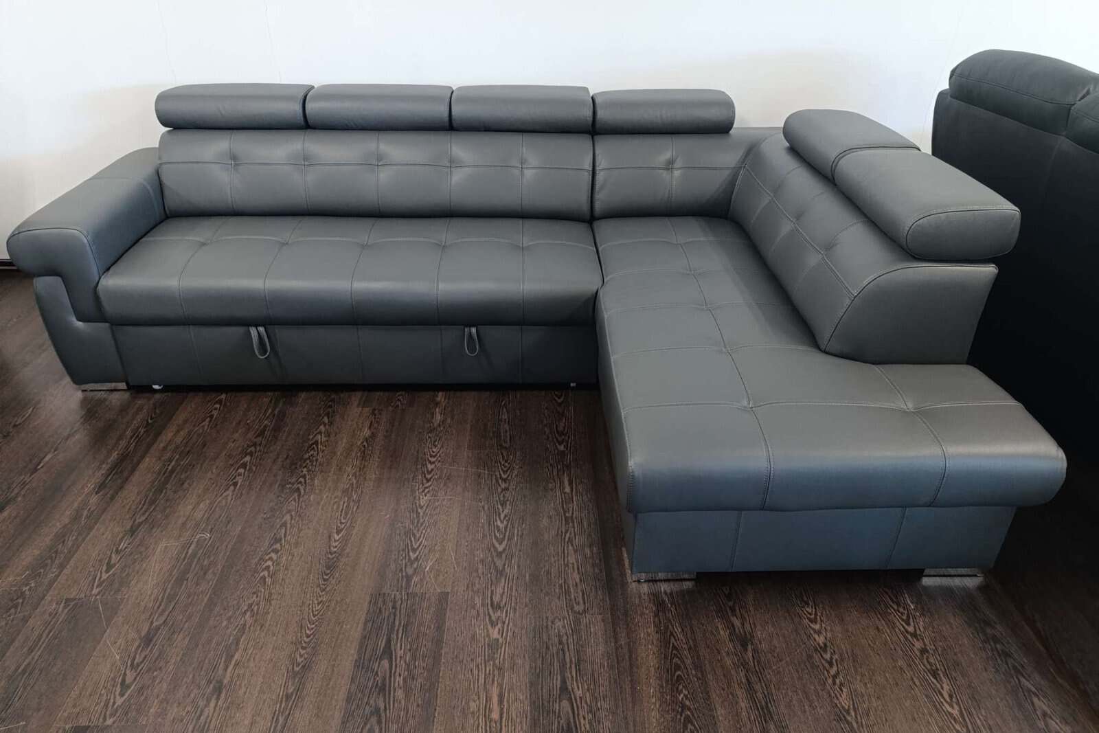 Narożnik wyposażony jest w funkcję spania wózkową przeznaczoną do codziennego użytkowania oraz pojemnik na pościel – w standardzie. Tył narożnika wykonany jest w skórze – w cenie.