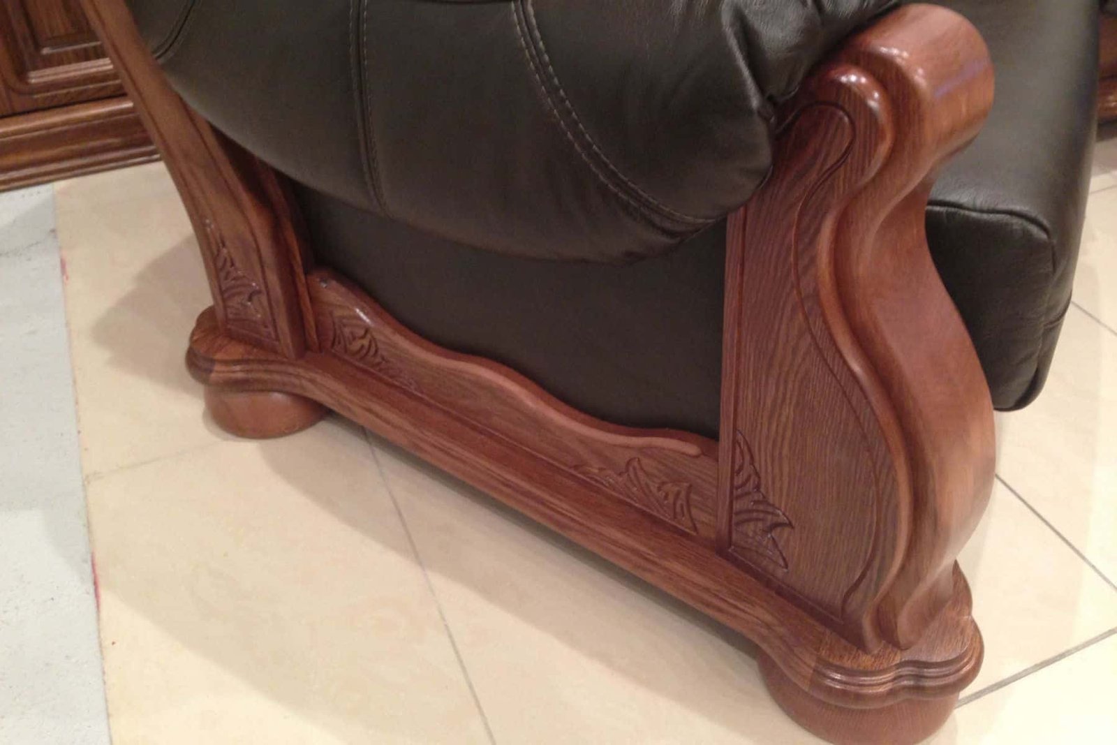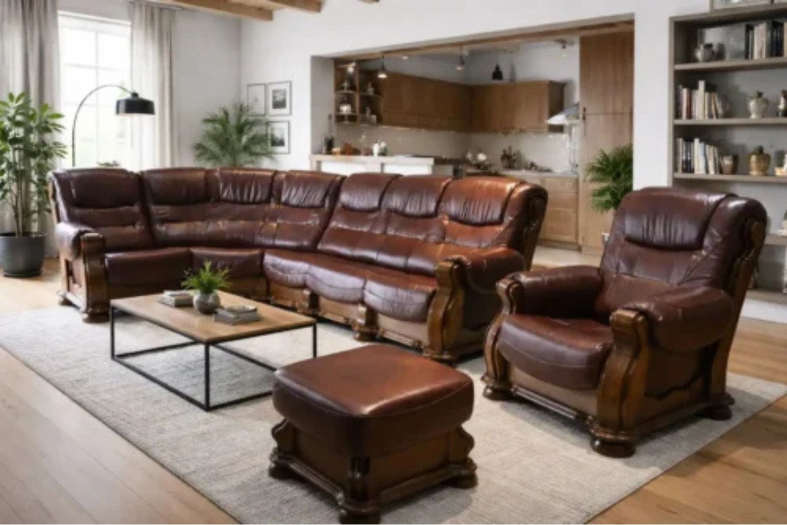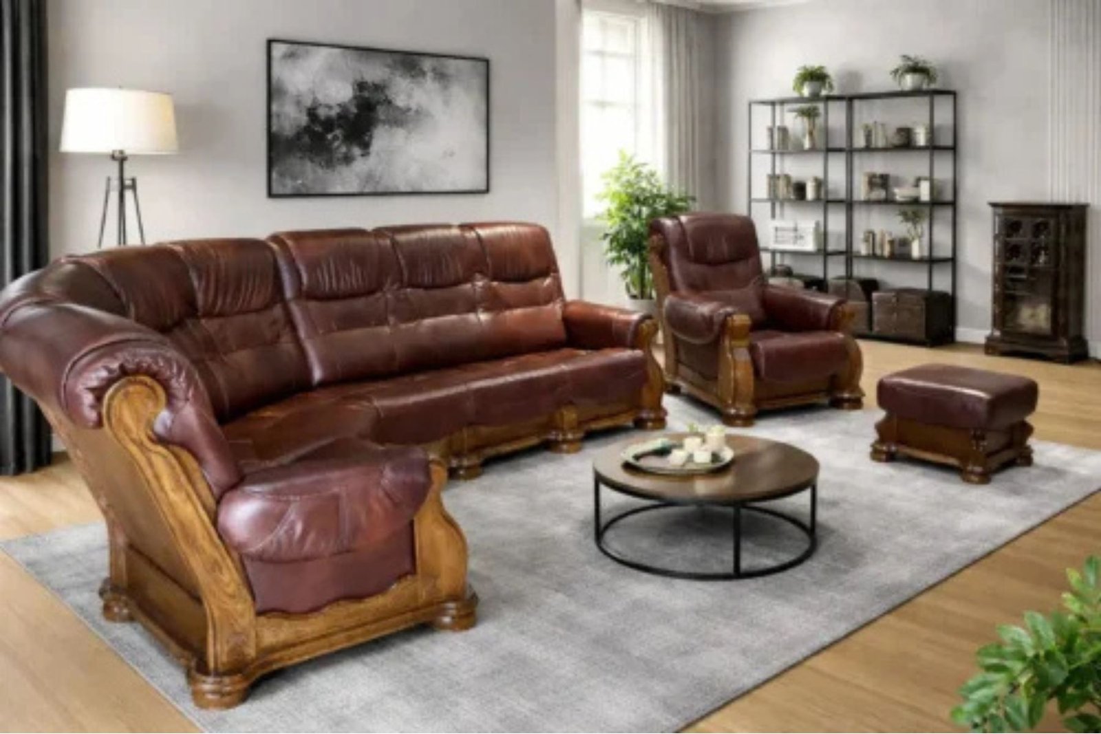 Narożnik Cezar II to masywny narożnik do salonu o eleganckiej, klasycznej formie, zaprojektowany z myślą o trwałości i wieloletnim użytkowaniu. Charakterystyczny stelaż z drewna dębowego nadaje meblowi prestiżowy wygląd i podkreśla jego solidny charakter. Tapicerka z naturalnej skóry oraz drewniane elementy sprawiają, że model dobrze komponuje się w klasycznych i eleganckich wnętrzach. Siedziska z pianki wysokosprężystej HR wsparte sprężyną bonelową zapewniają stabilność i odpowiednią sprężystość. W wybranych konfiguracjach dostępna jest funkcja spania belgijskiego. Model Cezar II to propozycja dla osób, które szukają dużego, reprezentacyjnego narożnika skórzanego z drewnianym wykończeniem.