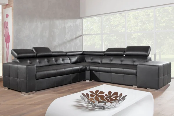 Prostą linię mebli Enzo wzbogacają subtelne przeszycia na oparciach a także chromowane nóżki. Natomiast indywidualny kształt oraz charakter nadają mu praktyczne zagłówki regulowane na wysokość oraz chowane w podłokietnikach narożnika pufy, które mają ogrom zastosowań. Kolekcja Enzo wzbogacona została o praktyczną funkcję spania. Dzięki odpowiedniemu wypełnieniu jest wręcz idealny do wypoczynku po całym dniu pracy, czy przed TV. Perfekcyjne wykonanie, prosty, subtelny kształt sprawiają, że narożnik wygląda wyjątkowo i jest bardzo elegancki.