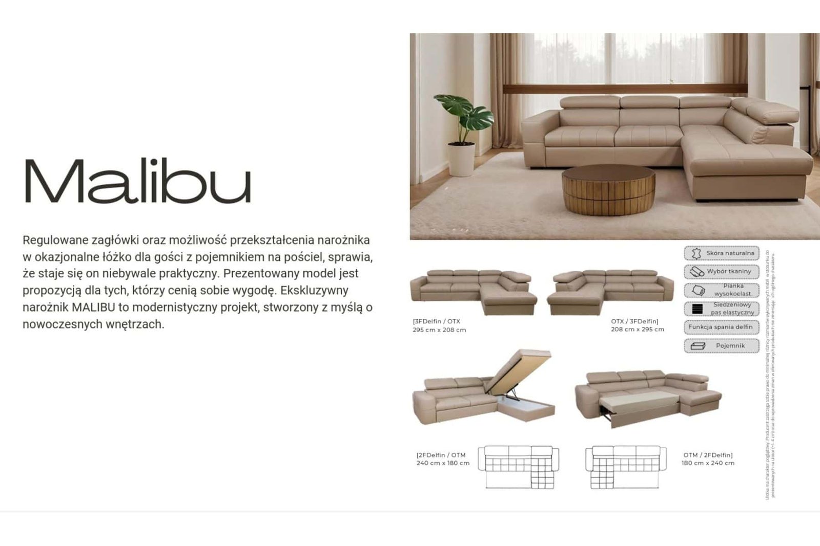 Narożnik Malibu to nowoczesny narożnik do salonu łączący minimalistyczny design z wysoką funkcjonalnością. Charakterystyczne pikowania na siedziskach podkreślają elegancki styl, a regulowane zagłówki (w wielu płaszczyznach) pozwalają dopasować pozycję do indywidualnych potrzeb. Model sprawdzi się jako wygodny narożnik wypoczynkowy do codziennego użytkowania oraz jako dodatkowe miejsce do spania. W wybranych konfiguracjach funkcja spania i pojemnik na pościel są w cenie.