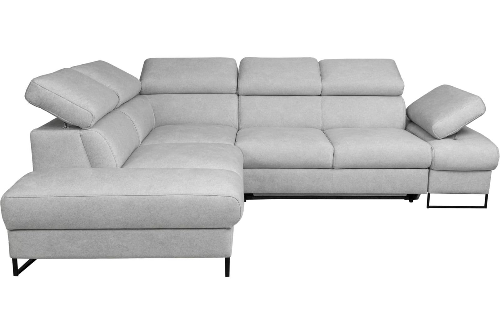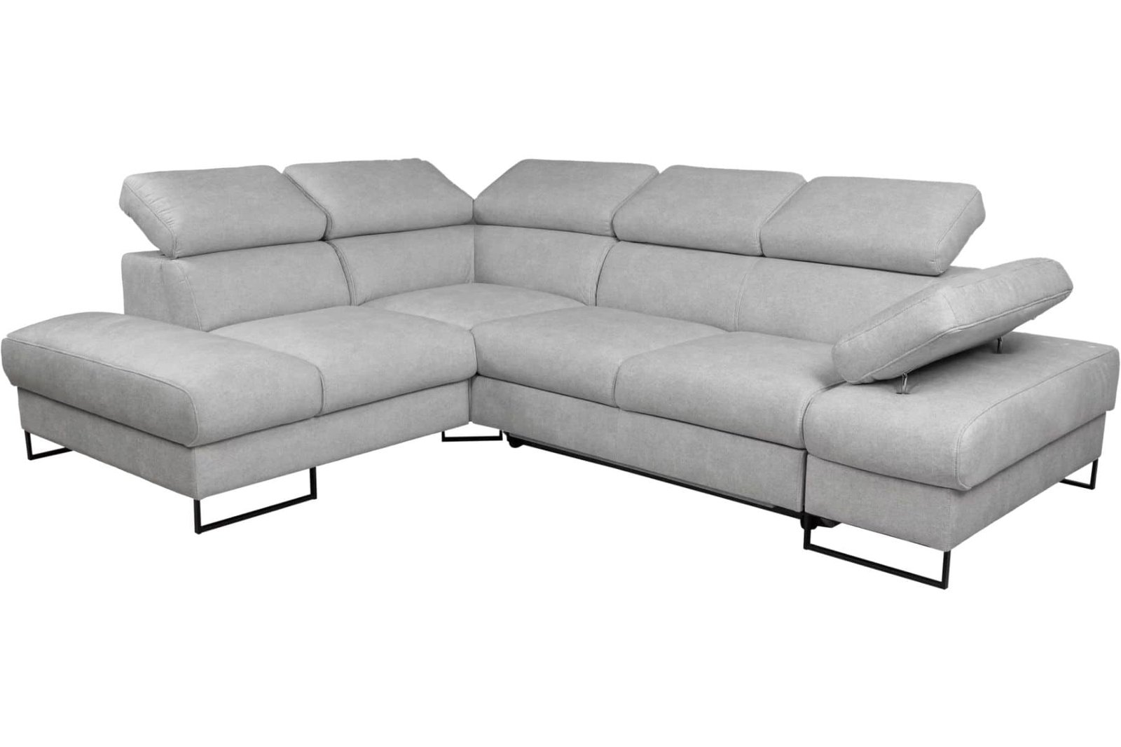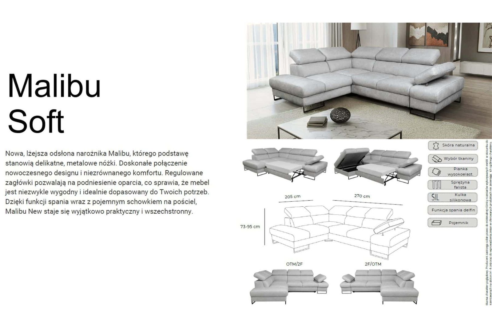 Narożnik Malibu Soft ze skóry to nowoczesny narożnik do salonu wykonany z wysokiej jakości włoskiej skóry naturalnej. Prosta, lekka bryła osadzona na smukłych metalowych nóżkach nadaje meblowi współczesny charakter i optycznie odciąża wnętrze, dzięki czemu model sprawdzi się zarówno w przestronnych, jak i bardziej kameralnych salonach. Regulowane zagłówki oraz regulowany podłokietnik umożliwiają dopasowanie pozycji oparcia do indywidualnych potrzeb, zwiększając komfort codziennego wypoczynku. Narożnik wyposażony jest w funkcję spania typu delfin oraz pojemnik na pościel w standardzie, co czyni go praktycznym rozwiązaniem do codziennego użytkowania. Malibu Soft to propozycja dla osób, które szukają nowoczesnego narożnika z funkcją spania i lekką, designerską formą.
