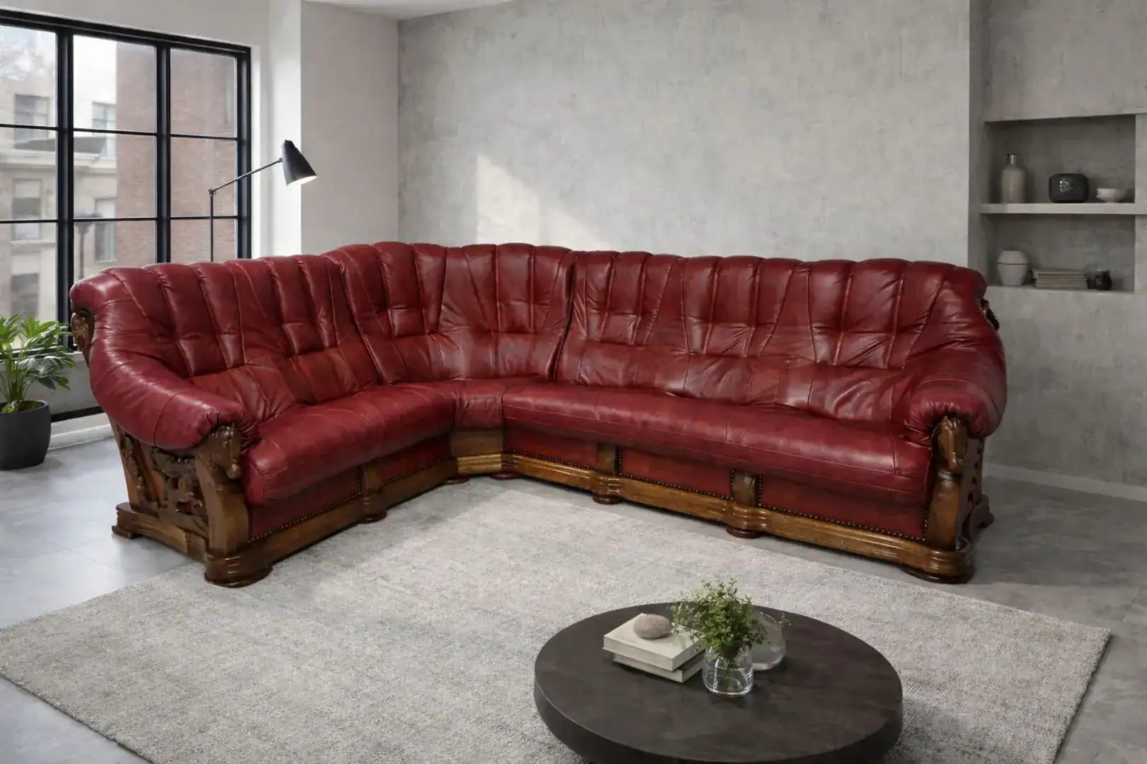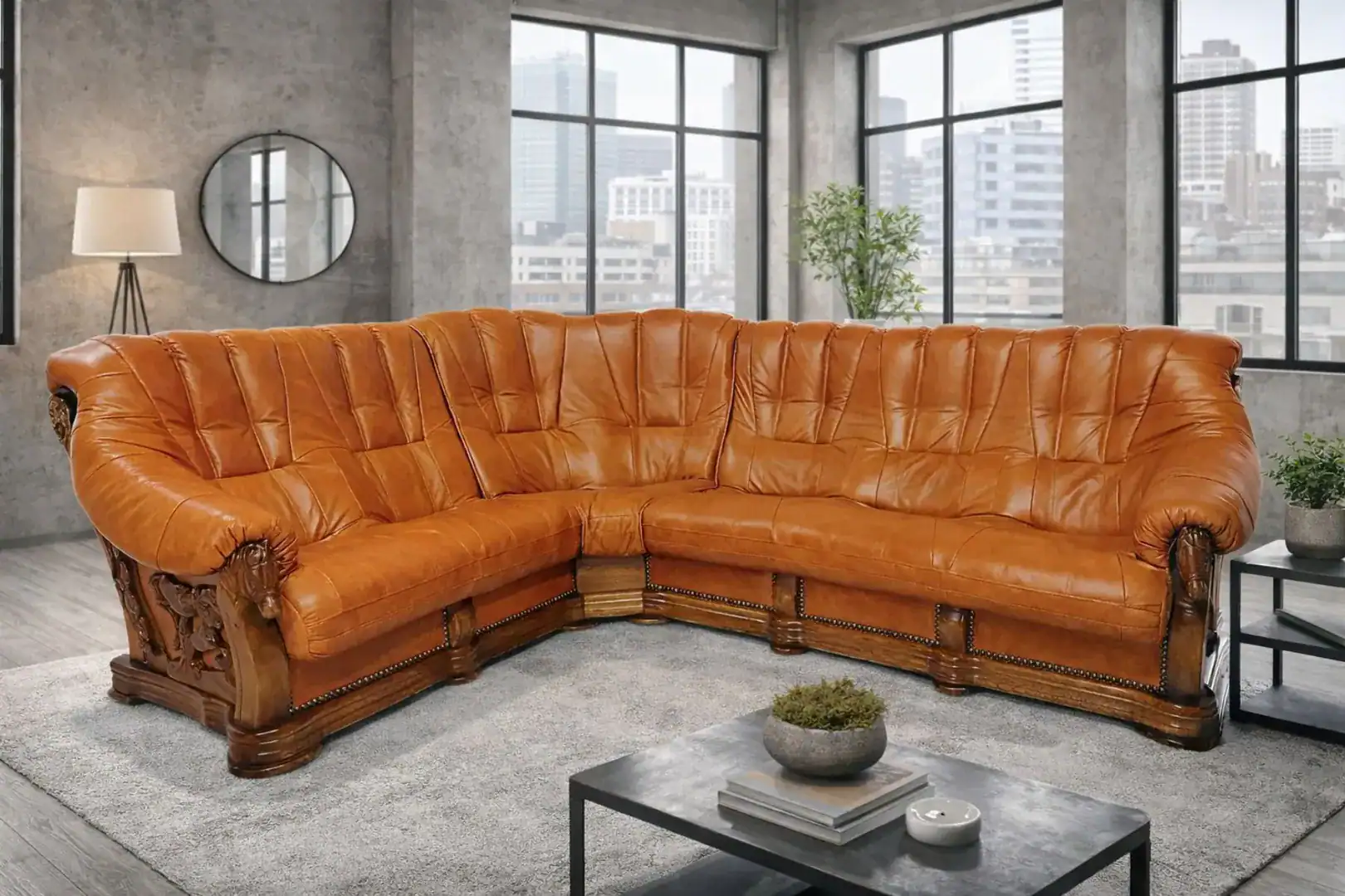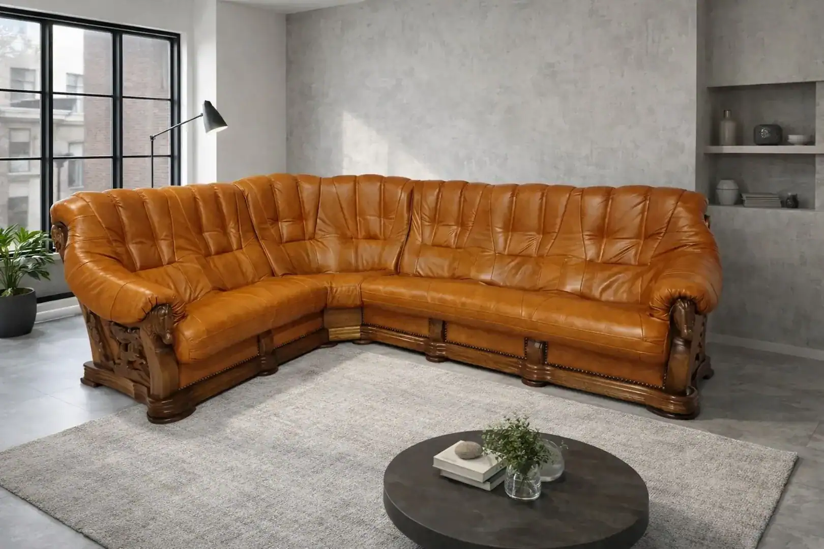Narożnik skórzany Oskar to elegancki narożnik do salonu o klasycznej formie i wyrazistym charakterze, zaprojektowany z myślą o wnętrzach w stylu loftowym oraz klasycznych aranżacjach. Model w całości tapicerowany jest naturalną skórą – również z tyłu – dzięki czemu może być ustawiony na środku pomieszczenia. Ozdobne ćwieki na plecach podkreślają rzemieślniczy i prestiżowy charakter mebla. Solidna konstrukcja oraz staranne wykończenie zapewniają trwałość i komfort użytkowania przez lata. W wybranych konfiguracjach dostępna jest funkcja spania belgijskiego. Oskar to propozycja dla osób, które szukają reprezentacyjnego narożnika skórzanego z dekoracyjnymi detalami.