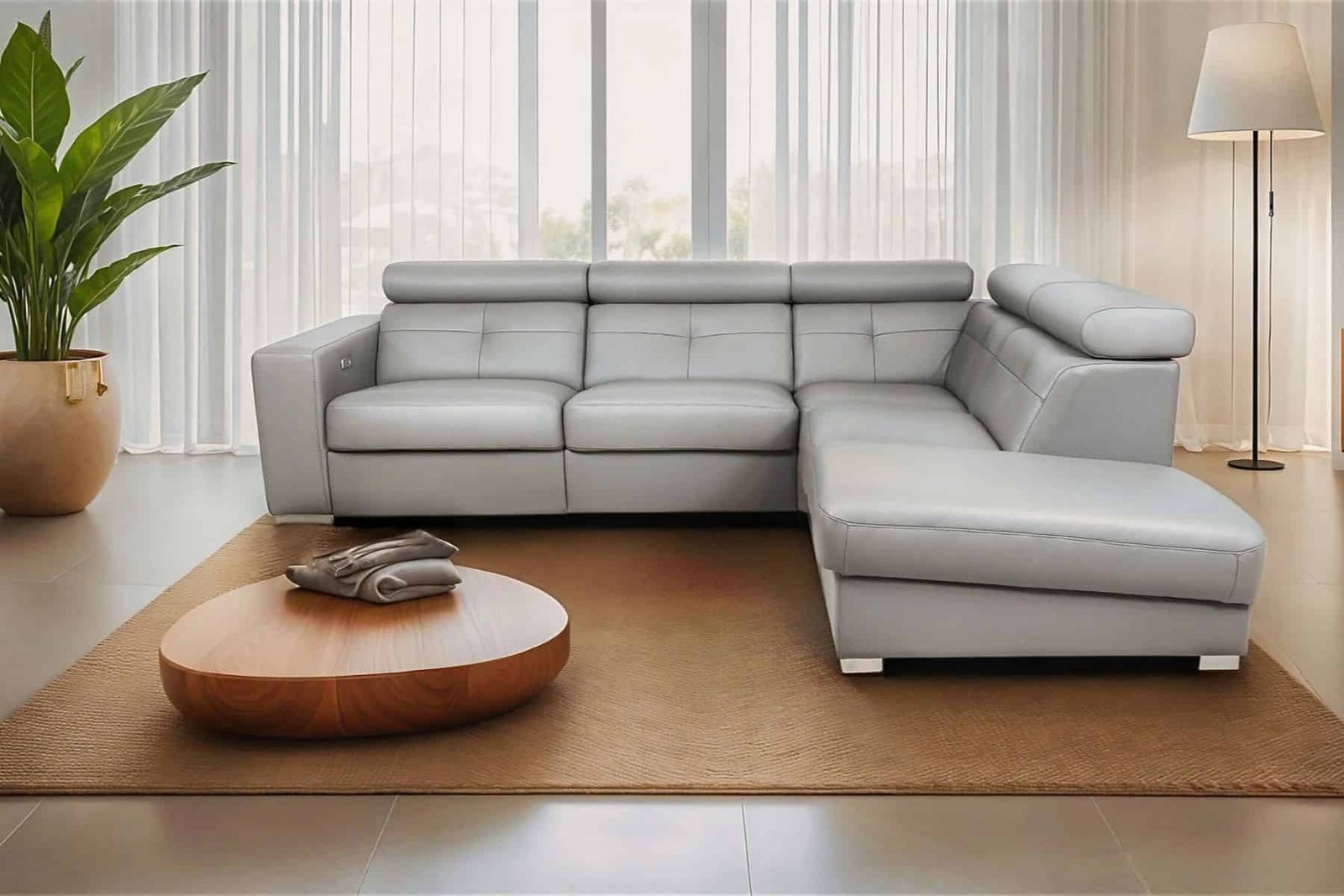 Narożnik Rubin to nowoczesny narożnik do salonu o prostej, minimalistycznej linii, wzbogaconej chromowanymi nóżkami i eleganckimi pikowaniami na oparciach. Regulowane zagłówki ustawiane w wielu płaszczyznach umożliwiają indywidualne dopasowanie wysokości i kąta podparcia. Model łączy estetykę z codzienną funkcjonalnością – w wybranych konfiguracjach dostępna jest funkcja spania wózkowa, idealna podczas pobytu gości. Rubin sprawdzi się w nowoczesnych i stonowanych aranżacjach.