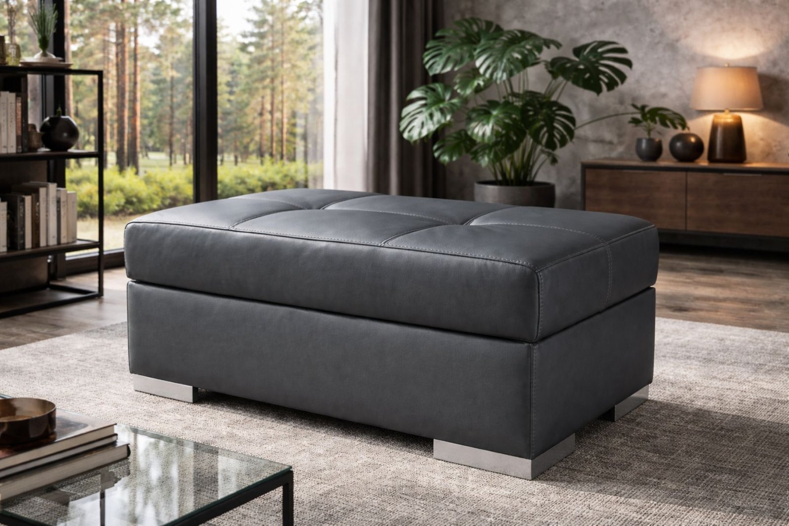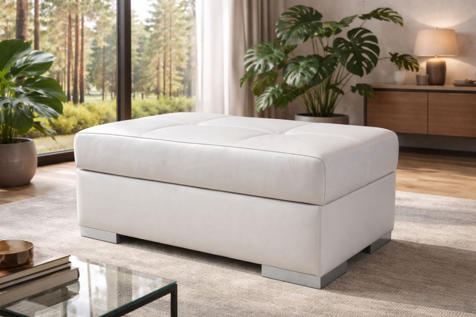 Pufa zachwyca eleganckim wyglądem i wysoką trwałością. Gładka powierzchnia skóry, subtelne podziały siedziska oraz stabilne, metalowe nóżki podkreślają jej nowoczesny charakter i wysoką jakość wykonania.