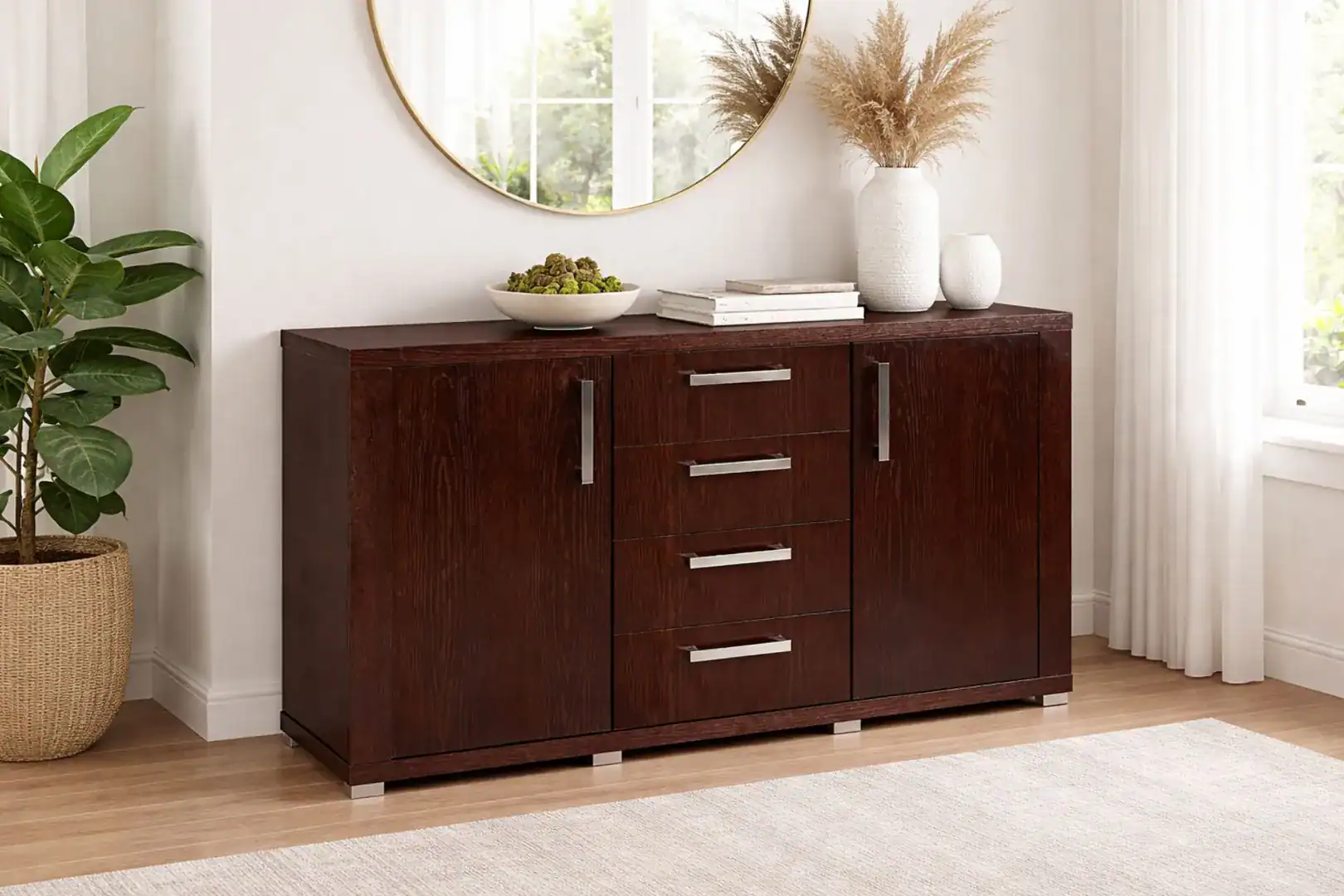 Charakterystyczne dla kolekcji REMI są gładkie fronty, metalowe uchwyty oraz solidna konstrukcja, która gwarantuje komfort użytkowania na co dzień. Przemyślany układ szuflad i półek zapewnia dużą funkcjonalność, dzięki czemu meble sprawdzą się zarówno w salonie, sypialni, jak i w reprezentacyjnych przestrzeniach domowych.