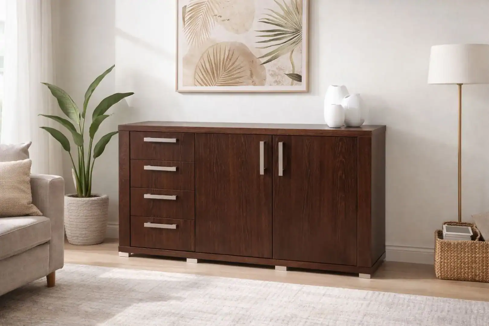 Charakterystyczne dla kolekcji REMI są gładkie fronty, metalowe uchwyty oraz solidna konstrukcja, która gwarantuje komfort użytkowania na co dzień. Przemyślany układ szuflad i półek zapewnia dużą funkcjonalność, dzięki czemu meble sprawdzą się zarówno w salonie, sypialni, jak i w reprezentacyjnych przestrzeniach domowych.