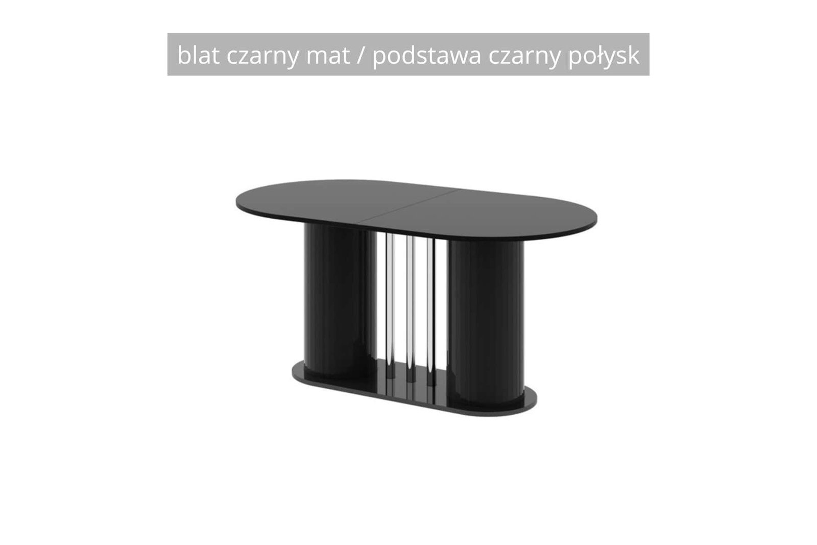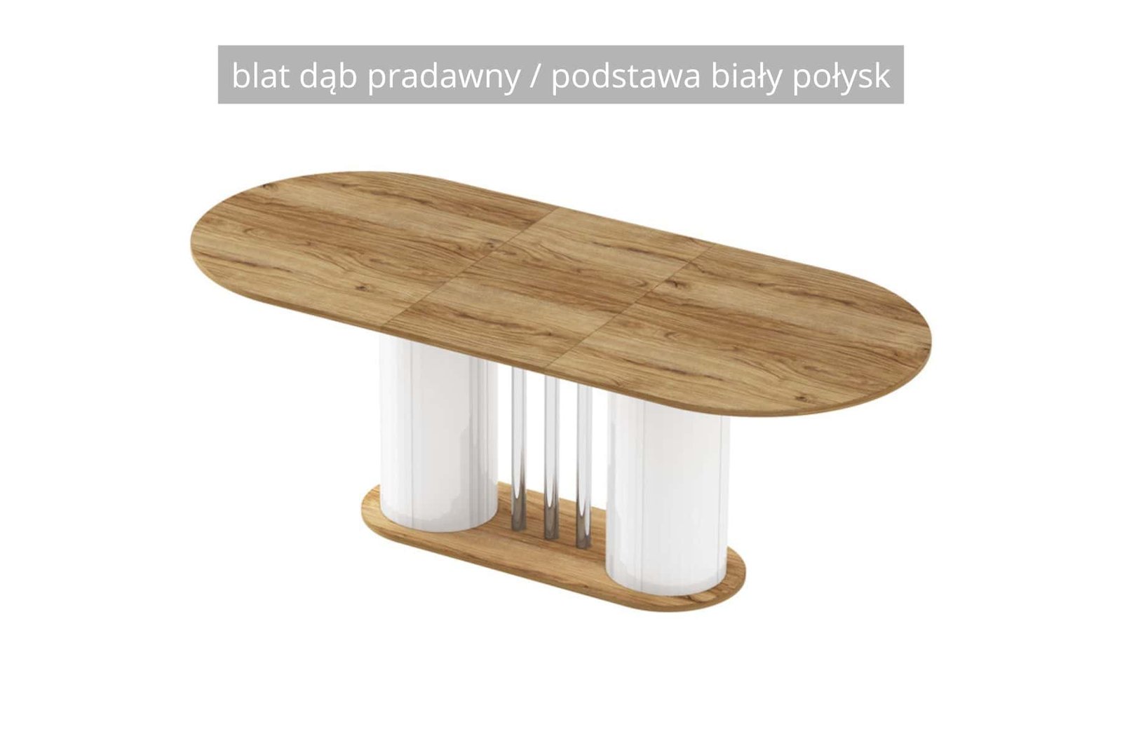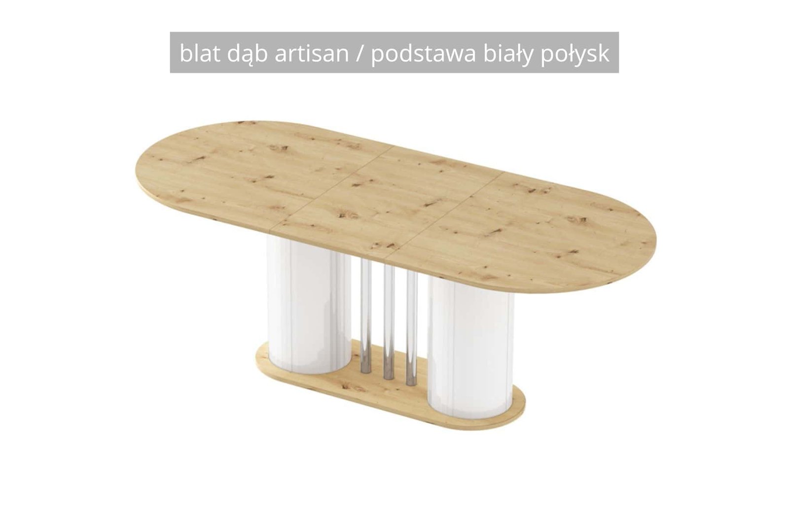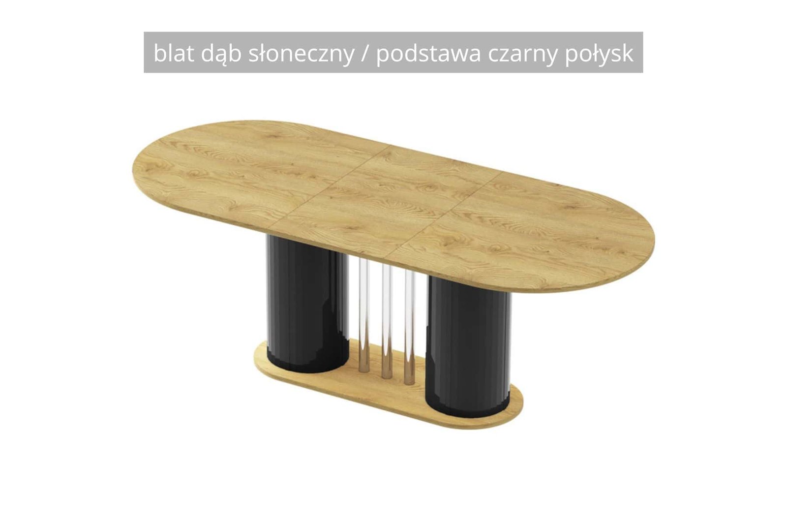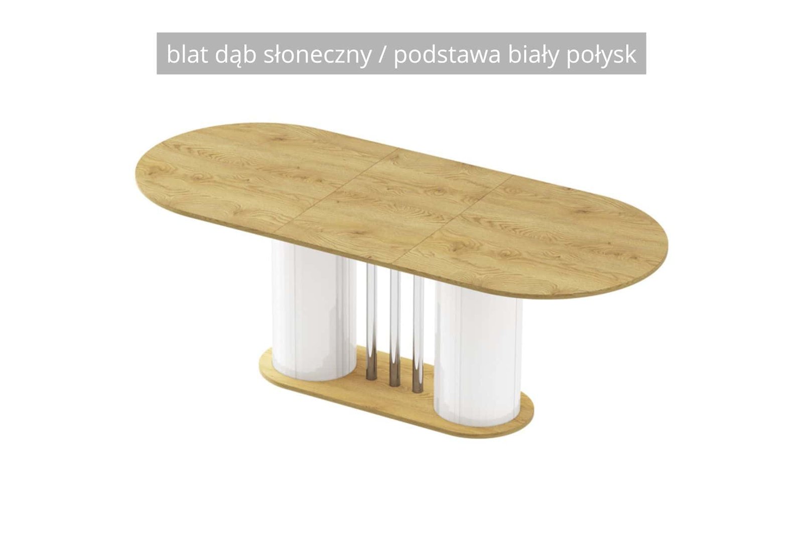 Stół CESARO to nowoczesna forma połączona z wysoką funkcjonalnością. Owalny w kształcie blat stołu opiera się na dwóch nowoczesnych kolumnach, pomiędzy którymi usytuowano eleganckie, ozdobne, chromowane rurki. Dzięki temu stół sprawia wrażenie delikatnej i finezyjnej konstrukcji, przy czym jednocześnie jest bardzo solidny, mocny i trwały. Swoim designem wpisuje się najnowsze trendy wzornicze w meblarstwie. Stół CESARO jest stołem bardzo praktycznym. Posiada funkcję rozkładania od 160 cm do 208 cm (jedna wkładka powiększająca chowa się pod blatem stołu).