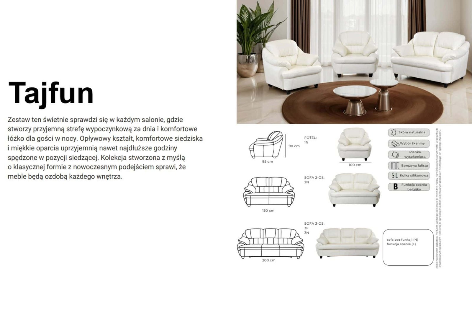 Wnętrze sofy Tajfun to drewniany stelaż, sprężyny bonellowe, sprężyny faliste i pianka wysokosprężysta HR, to wszystko sprawia, że nawet po długotrwałym użytkowaniu komplet nie traci pierwotnego kształtu. Dzięki okrągłym i „puszystym” kształtom stał się jednym z najbardziej wygodnych mebli salonowych. Szczególnie nadaje się do średniej wielkości wnętrz. Idealne do wypoczynku i relaksu.