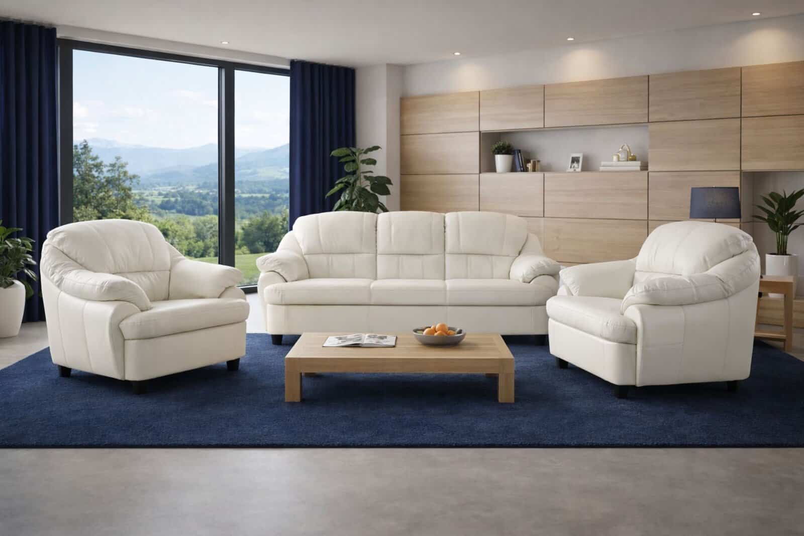 Tajfun to niski, wyjątkowo komfortowy komplet wypoczynkowy, idealny do mniejszych oraz średniej wielkości wnętrz. Konstrukcja oparta na solidnym drewnianym stelażu, sprężynach bonellowych, piance wysokoelastycznej oraz wkładzie silikonowym zapewnia trwałość i zachowanie pierwotnego kształtu nawet po wieloletnim użytkowaniu.