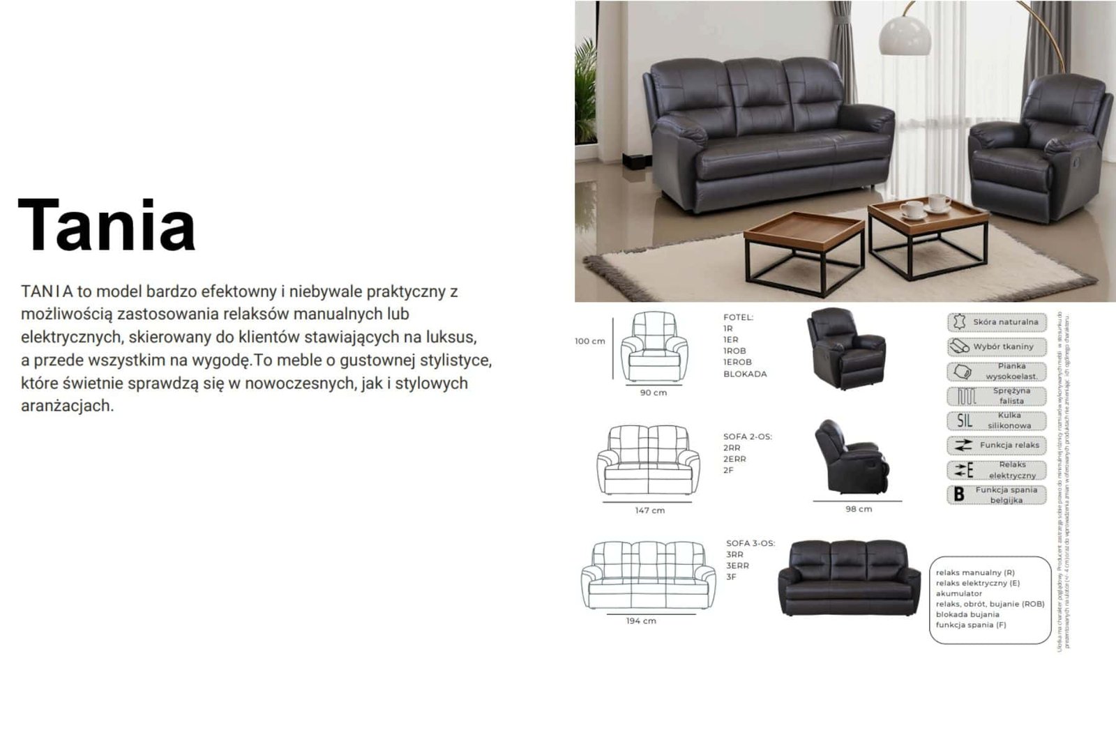 Elegancja i szyk to główne zalety tego kompletu. Posiada wygodne funkcje relaks idealne do wypoczynku po całym dniu. Dzięki niewielkim rozmiarom idealnie nadaje się do mniejszych pomieszczeń. Meble na wkładzie silikonowym – bardzo mięciutkie!